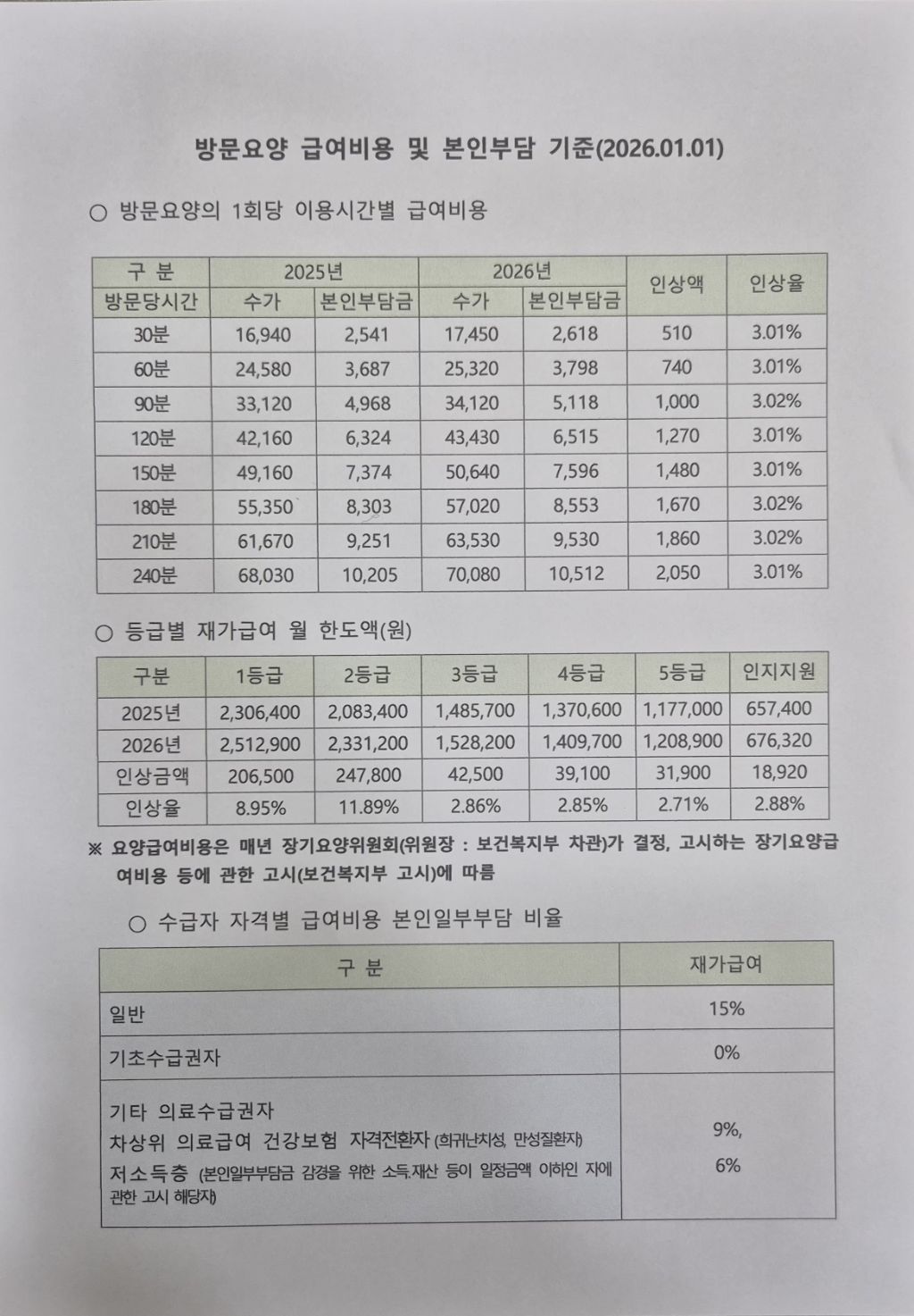 2026년도 방문요양 급여비용 및 본인부담 기준을